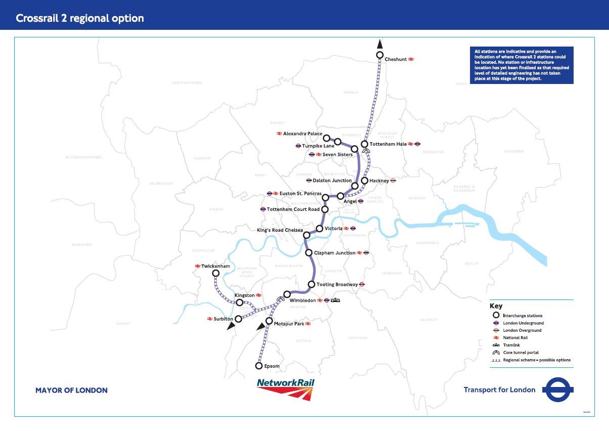 (Image: Crossrail 2 regional option map, c. Transport for London)