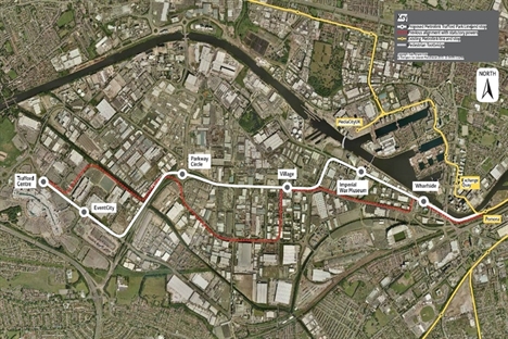 The 5.5km route will run from the existing network at Pomona alongside Manchester Ship Canal before following Trafford Wharf Road, running through the village area of Trafford Park and crossing Parkway Circle to terminate at the Trafford Centre.