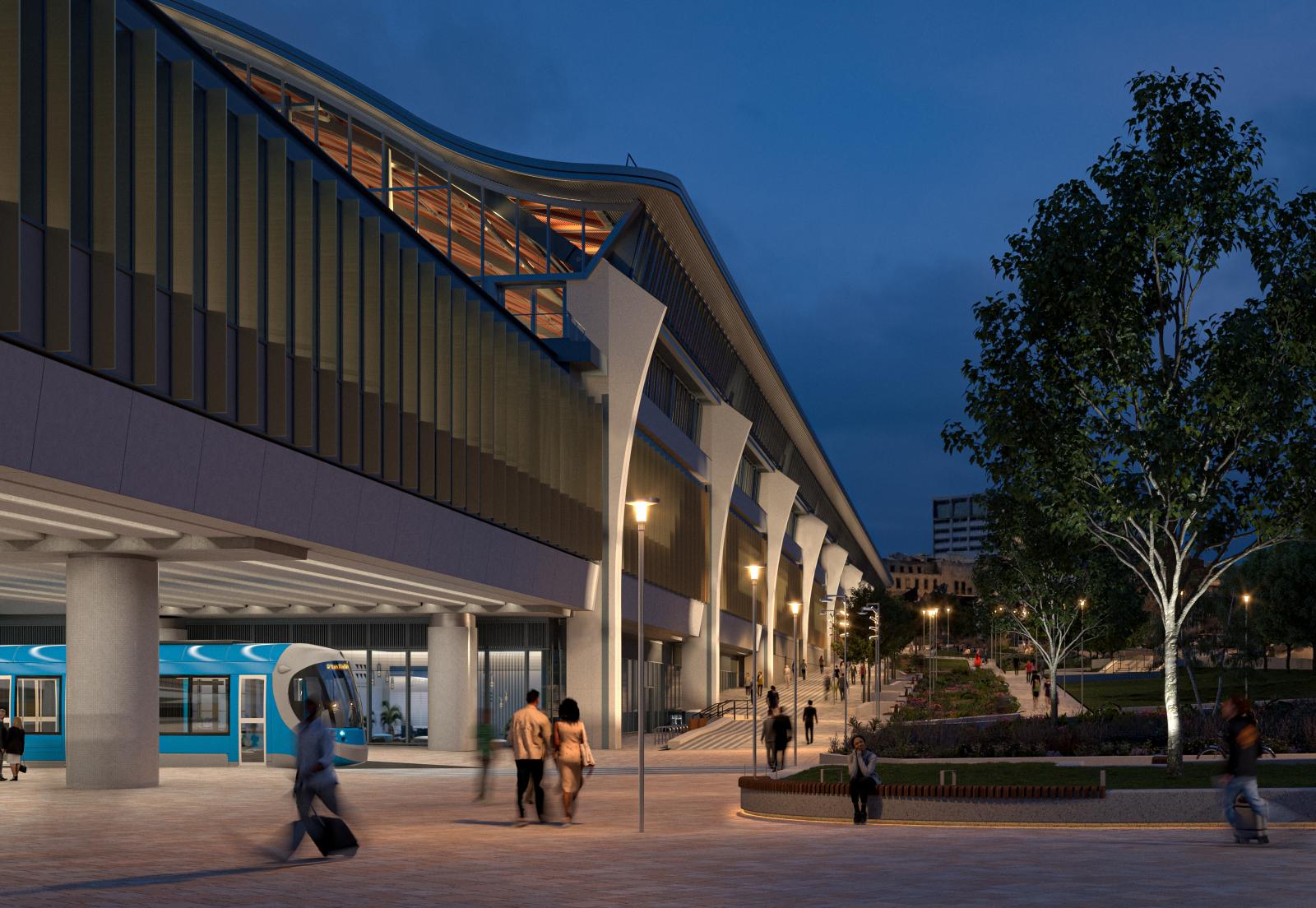 Plans highlight a tree‑lined promenade running the length of the station, connecting major city destinations.